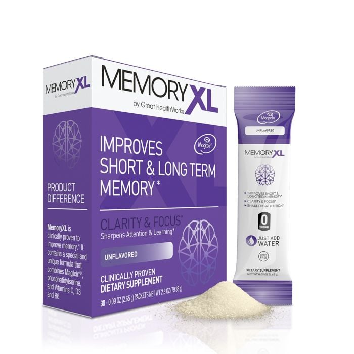 MemoryXL is a stick pack supplement combining Magtein®, phosphatidylserine, and vitamins C, D, and B6. This formula is clinically proven to improve markers of learning, memory, and cognition by up to 50% after only 4 weeks of daily use.* These include short-term auditory, learning and logic, short-term visual, recall memory, and complex memory.